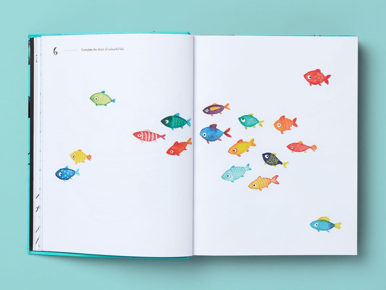 The cover featured a bright turquoise palette with spot-varnished illustrated splashes, paired with black spray-blocked edges for striking on-shelf impact. Inside, layouts were carefully balanced to accommodate activities ranging from simple shape drawing to detailed tutorials, always encouraging readers to experiment and explore.