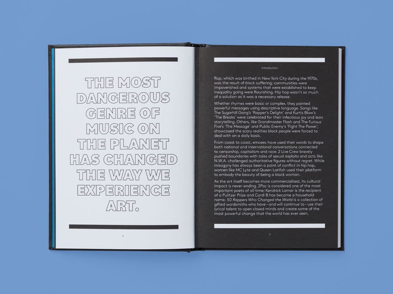 Written by music journalist Candice McDuffie, this book charts rap’s journey from the 1970s to today, featuring pioneers and global superstars. We designed the cover using gold-foiled frames to hold Michele Rosenthal’s portraits, paired with bold typography and a subtle nod to the parental advisory label. Inside, bold introductory spreads and illustrated profiles combine to reflect the energy and attitude of rap culture.