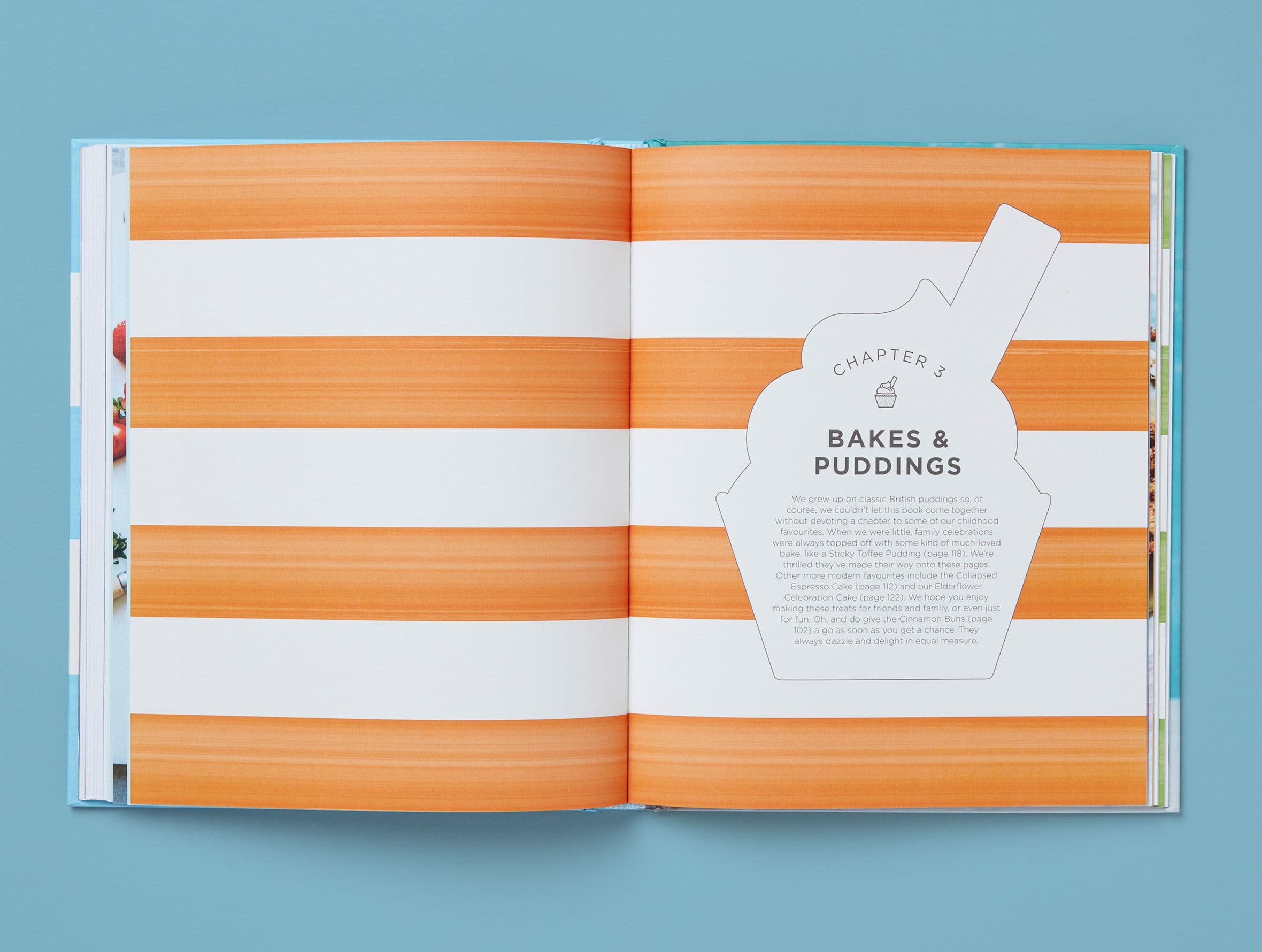 The cover combines gold-foiled type with Jude’s signature coloured stripes, echoed as chapter openers throughout the book. Chapter introductions sit inside playful shapes — from cones to sundaes — while photographic endpapers feature the full line-up of Jude’s ice-cream tubs, creating a colourful opening and close.