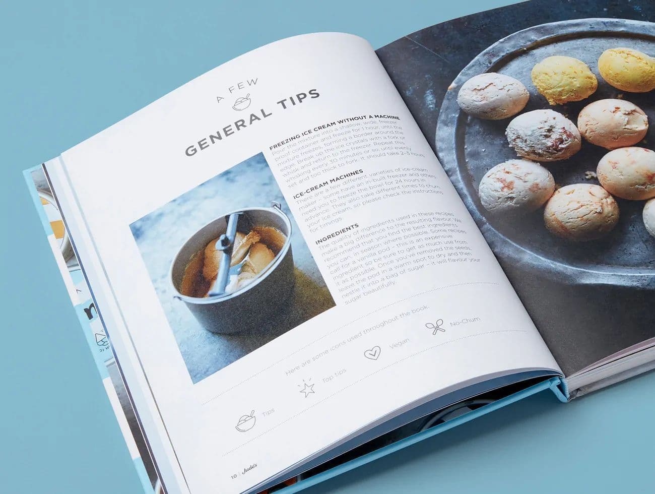 Clean, contemporary typography paired with bold photography ensures the recipes remain centre stage. Running footers using Jude’s logo and a dessert spoon add a playful branded touch to every page. Icons in Jude’s packaging style highlight vegan options, no-churn recipes, and tips for making ice cream at home, improving navigation and usability.
