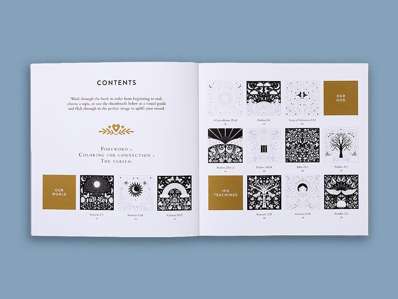 We were commissioned to design a spiritual colouring book series for adults, combining uplifting scripture with soothing patterns to promote relaxation and reflection. Each page features intricate illustrations, with gold detailing used to create a sense of beauty and value.